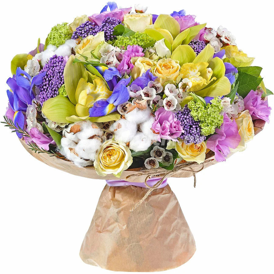На фото представлен образец. Объем букета зависит от выбранного вами размера. Точное количество цветов и цветовую гамму вы можете уточнить у менеджера по телефону.