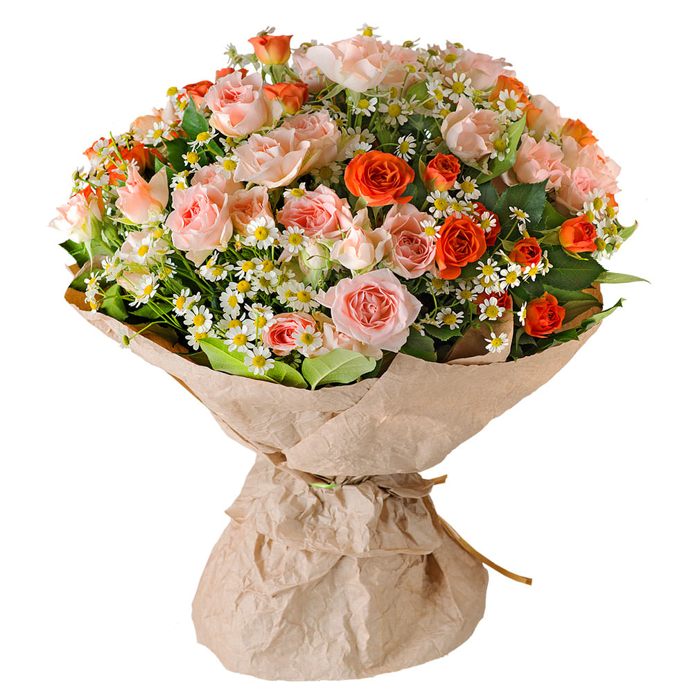 На фото представлен образец. Объем букета зависит от выбранного вами размера. Точное количество цветов и цветовую гамму вы можете уточнить у менеджера по телефону.