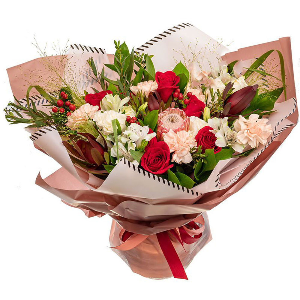 На фото представлен образец. Объем букета зависит от выбранного вами размера. Точное количество цветов и цветовую гамму вы можете уточнить у менеджера по телефону.