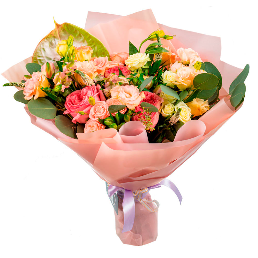 На фото представлен образец. Объем букета зависит от выбранного вами размера. Точное количество цветов и цветовую гамму вы можете уточнить у менеджера по телефону.
