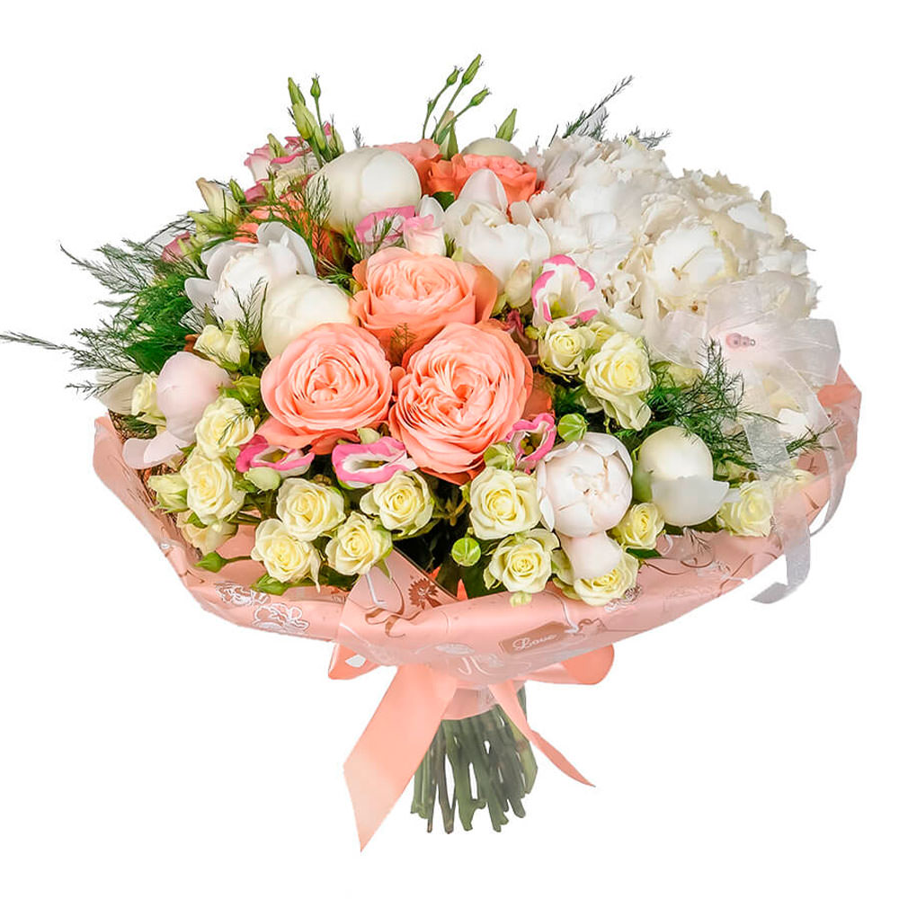 На фото представлен образец. Объем букета зависит от выбранного вами размера. Точное количество цветов и цветовую гамму вы можете уточнить у менеджера по телефону.