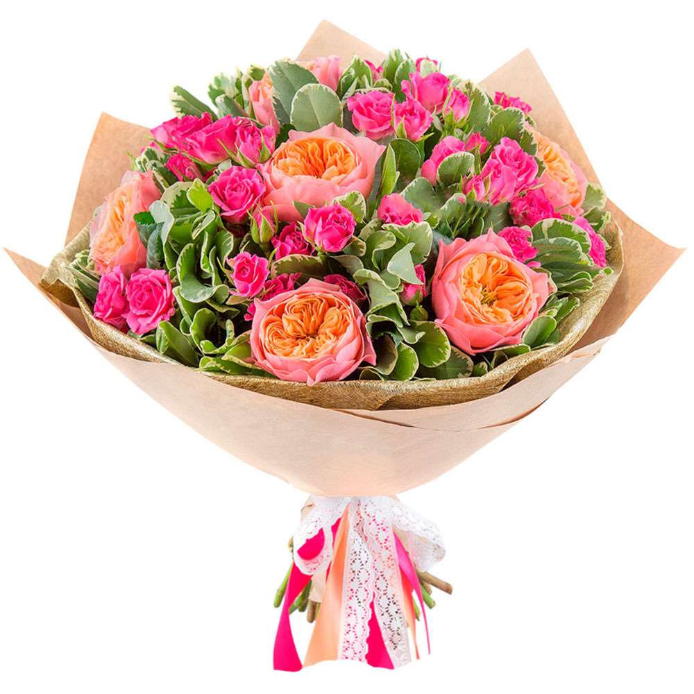 На фото представлен образец. Объем букета зависит от выбранного вами размера. Точное количество цветов и цветовую гамму вы можете уточнить у менеджера по телефону.