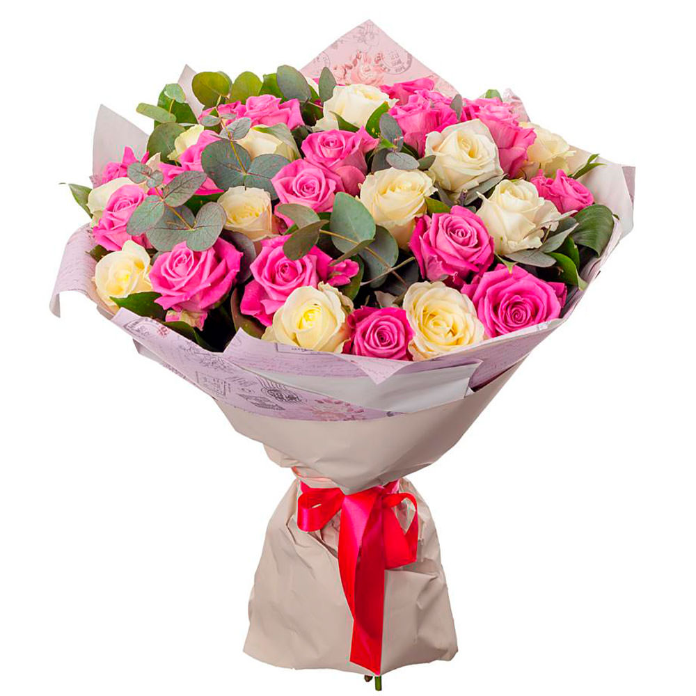 На фото представлен образец. Объем букета зависит от выбранного вами размера. Точное количество цветов и цветовую гамму вы можете уточнить у менеджера по телефону.