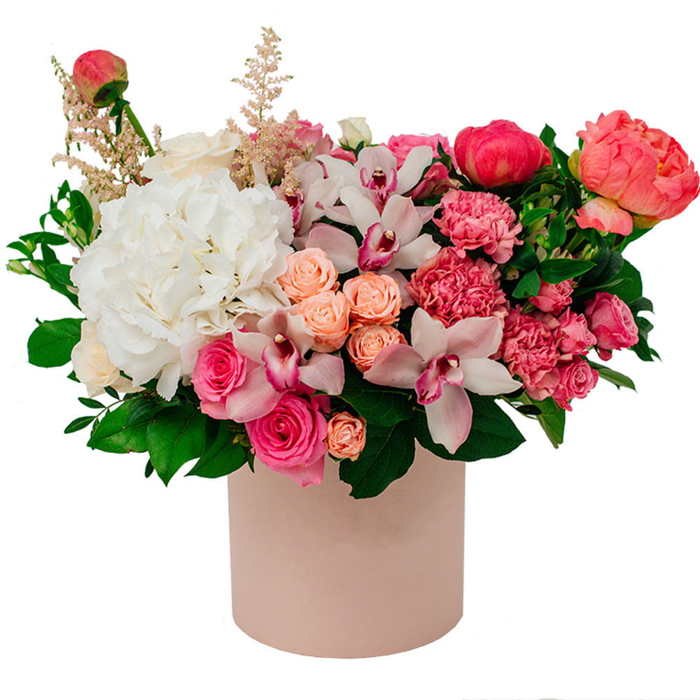 На фото представлен образец. Объем коробки зависит от выбранного вами размера. Точное количество цветов и цветовую гамму вы можете уточнить у менеджера по телефону.